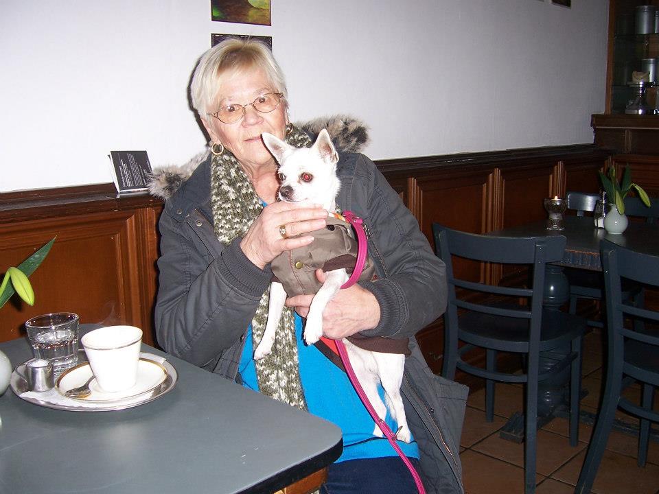 Va con ella a todas partes, su vecino un Lulú pomeraneo es su gran amigo. Y en el parque se ve junto a Guapa y Paco.